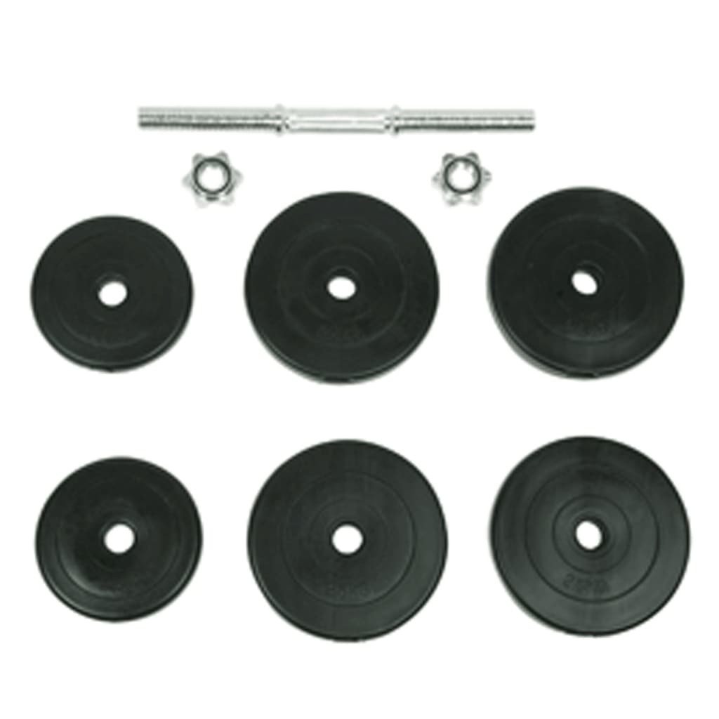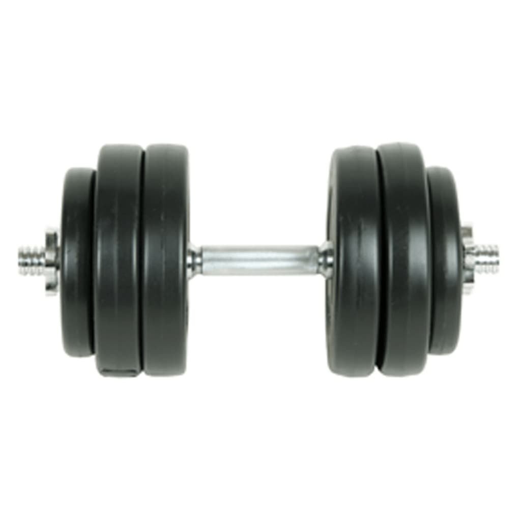 The structure of the handle provides maximum grip so the dumbbell bar lies firmly in your hands. This dumbbell has star-shaped screw collars in order to keep the weights in place. This set can be easily combined with our weight benches or other dumbbell sets.Color: BlackWith a plastic coverDumbbell bar dimensions: 1" x 17.7" (Diameter x L)Dumbbell bar weight (with screw collars): 5.5 lbTotal weight: 33.1 lbFilled with sandStar-shaped screw collarsDelivery includes:4 x Weight plate (5.5 lb)2 x Weight plate (2.8 lb)1 x Dumbbell bar2 x Screw collar