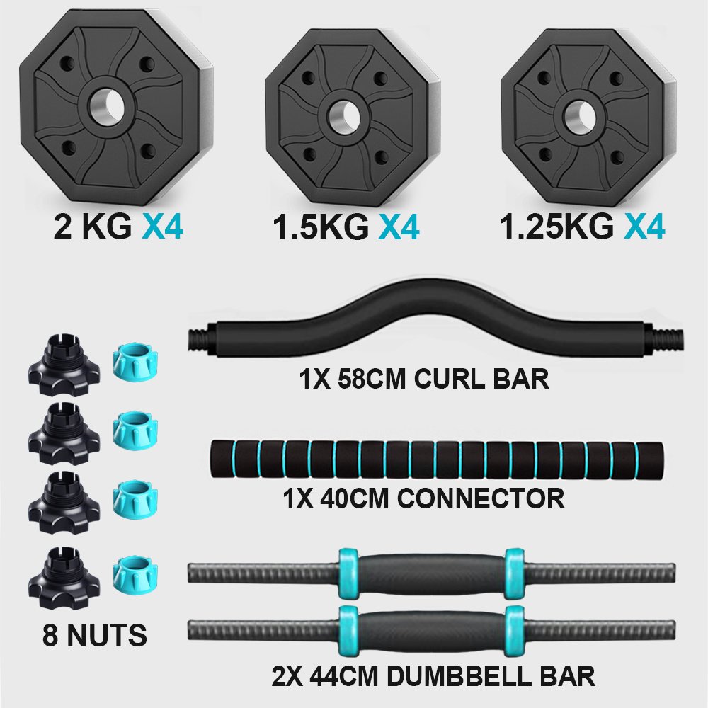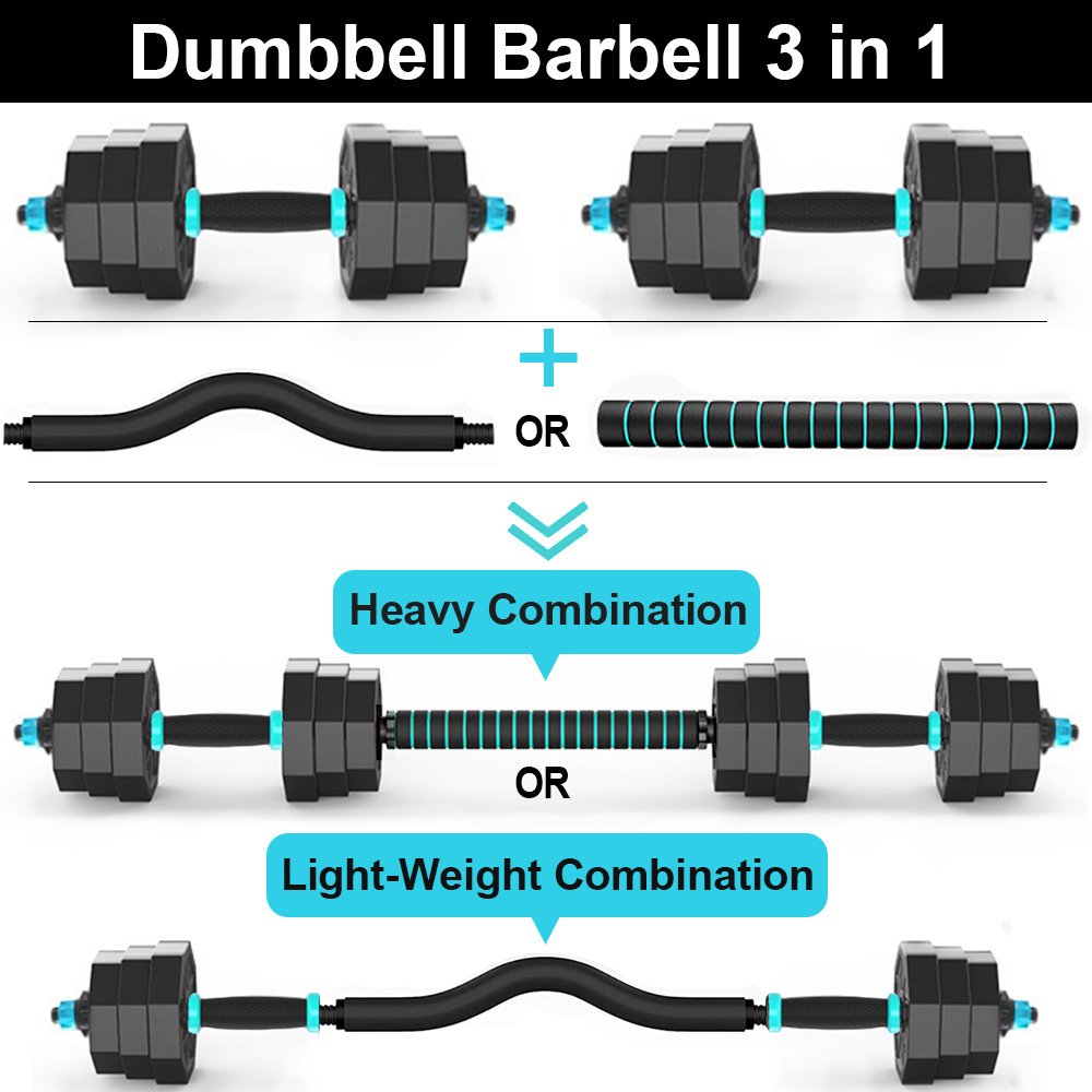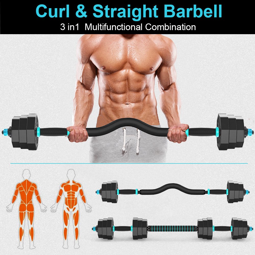 Curl Bar Can Help You: With the curl bar, hand placement allows wrists to remain in a more neutral position during exercise, thereby keeping them from bending at uncomfortable and possibly damaging angles.3 in 1 Multifunctional Dumbbell Set: The dumbbell set can be adjusted into barbell set easily with the central connector.Free combination is more convenient: the weight can be freely adjusted to suit the use of various forces.New environmentally friendly PVC material: wear-resistant and non-slip, better protection of the floor, 40cm thick foam connector, safe decompression plus non-slip, sweat-proof and comfortable handle, for pleasant exercise anytime, anywhereFor Sport Lovers: The barbell weight set is ideal fitness equipment for everyone who loves sports.It helps train your muscle, quads, glutes, abs, biceps.Simple assemble, small size, the best choice for home fitnessPackage includes: 1 x 40cm straight connector, 1x58cm curl connector, 2 x 40cm dumbbell bar, 8 nuts, 1.25KG x 4 + 1.5KG x 4 + 2KG x 4 plates