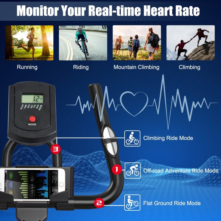 The flywheel is made of refined steel and driven by a belt; making your riding smooth and unobstructed. It is near-silent; so you can enjoy a person's sports time. You can adjust the resistance according to your different exercise intensities.