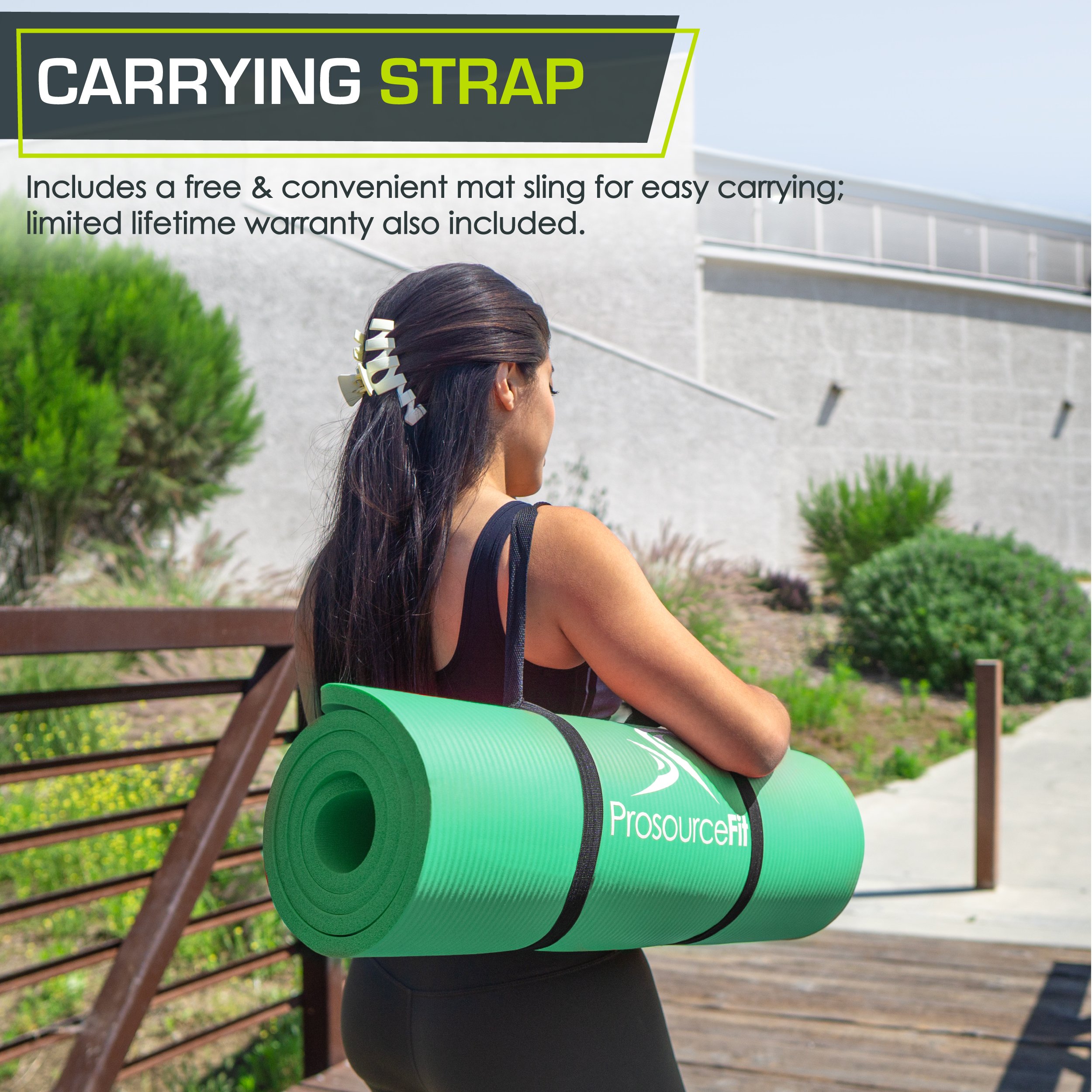 Enjoy your yoga or Pilates practice without having to bunch up towels to put under your knees or back. Get all of the comfort and cushion you need from the ProsourceFit Extra Thick Yoga and Pilates Mat. Choose from ½-inch (13mm) or 1-inch (25mm) thick foam for the protection you need for floor exercises. The ½-inch creates a barrier between you and hard floors so you can do camel pose, boat pose, the Pilates 100, or cat cow without discomfort. Have super sensitive joints or recovering from a recent injury? Opt for the 1-inch to get superior comfort so working out doesn't have to be painful. At almost 6-feet long, this mat suits most anyone, even tall users. Ribbed NBR foam provides a non-skid mat surface for fitness and exercise of various types and it is naturally moisture-resistant. It’s easy to clean and roll up after working out and it comes with a free mat sling to make it easy to carry to and from your yoga or Pilates workout session! Choose from 8 color options for the ½-inch mat comes and 3 colors for the 1-inch mat. Care Instructions: Wipe mat with wet cloth or sponge. Allow plenty of time to dry. Not machine washable