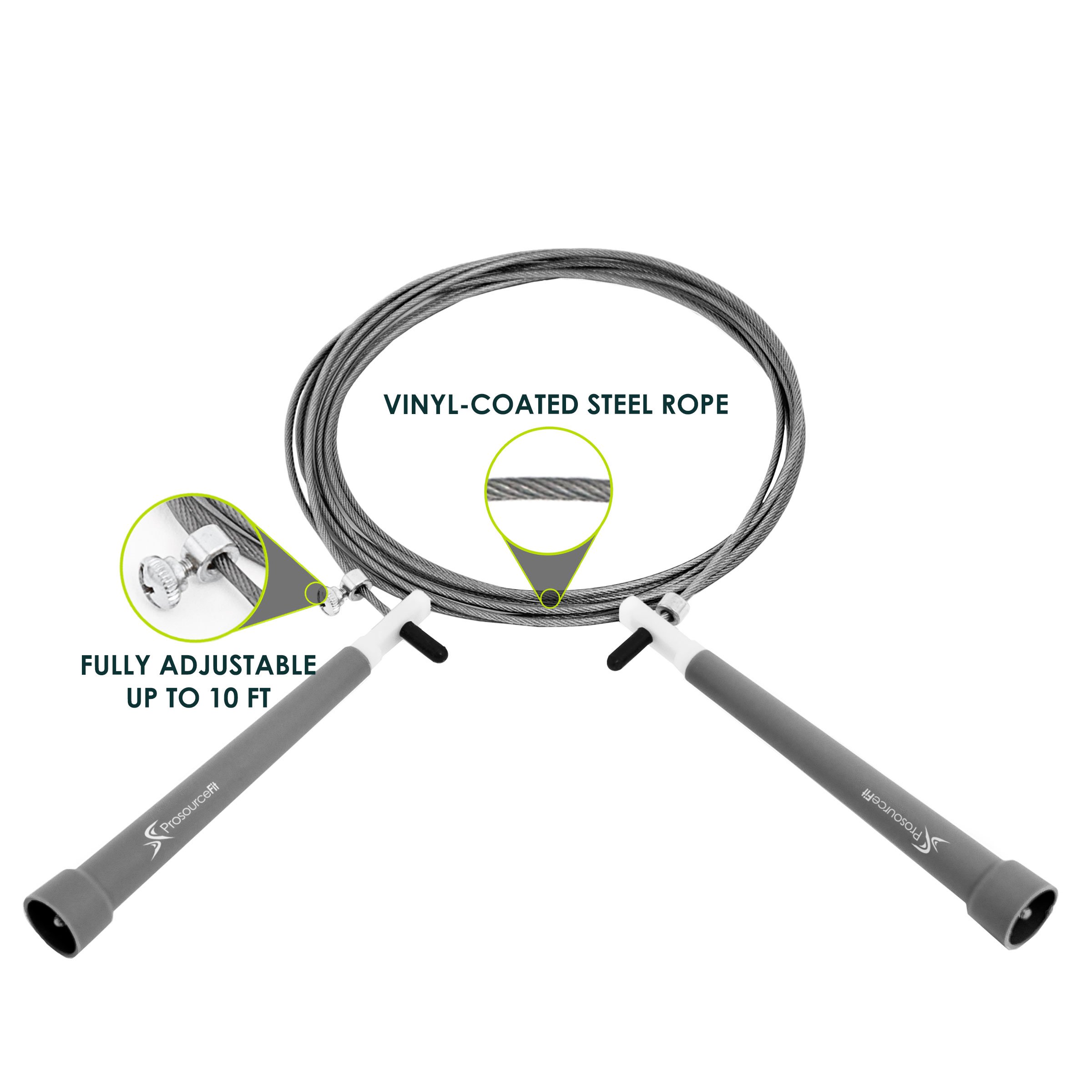 The ProsourceFit Speed Jump Rope is a must-have for anyone who’s trying to stay fit and healthy. Whether you’re a boxer or competitive athlete, or simply want to lose a few pounds and improve your endurance, jump roping is a perfect cardio solution. The small, lightweight rope makes fast-turning super easy so you can jump with speed and perform exercises like double unders with ease. It’s perfectly portable, so you can take it with you when you travel and don’t have access to a gym, or carry it in your gym bag for high intensity training between weight lifting sets. It’s also great for kids and teenagers to improve coordination and agility and stay active while having fun! The adjustable rope fits anyone up to up to 6' 6" tall. Just measure the rope by standing on the middle of the cord and the end of the handles come up to the top of the jumper's shoulders. Simply adjust the length with an easy screw/lock using fingers or a screw driver (recommended). Make sure it is clamped tight before jumping. You can also cut off the extra cable. Train like a pro, train with ProsourceFit!