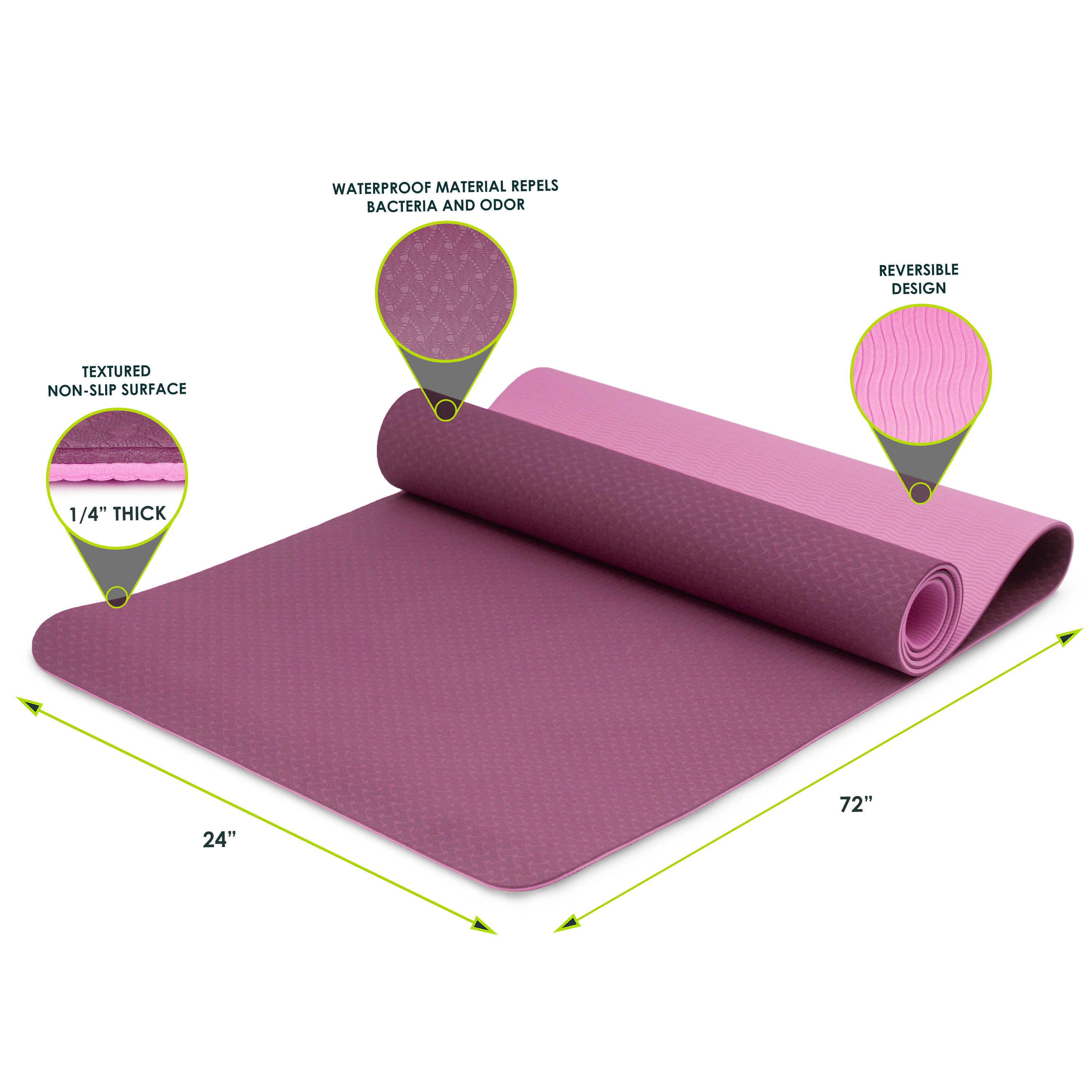 The ProsourceFit Natura Yoga Mat is ideal for the yogi who wants it all – gentle cushion, excellent traction, easy to roll, and aesthetic appeal. High-density and ¼-inch thick, this mat provides the perfect blend of stability and cushioning to protect your joints while offering a steady surface for improved balance. With a colorful and fully reversible design, the two-toned yoga mat features a unique, textured pattern on each side to prevent slipping and give you a superior grip. This mat can also be used for floor Pilates, so it’s like buying two mats for the price of one, offer-ing you the best value! The closed-cell TPE is moisture-resistant and repels sweat so you avoid the smell common in other mats after regular use. The material is extremely hygienic for a mat that stays fresh and is easy to maintain. Recyclable and free of toxic materials like phthalates, your mind can be at ease knowing you’re not harming the environment, so you can focus on your practice and meditation. Great for beginners as well as experienced yogis, whether at home, the park, or in the studio. And when you’re done, it rolls up easily so it’s compact for simple travel and storage. It’s the perfect balance for a perfect practice! ProsourceFit is so confident in the high quality of our mats, that we offer a limited lifetime warranty on all yoga mats!