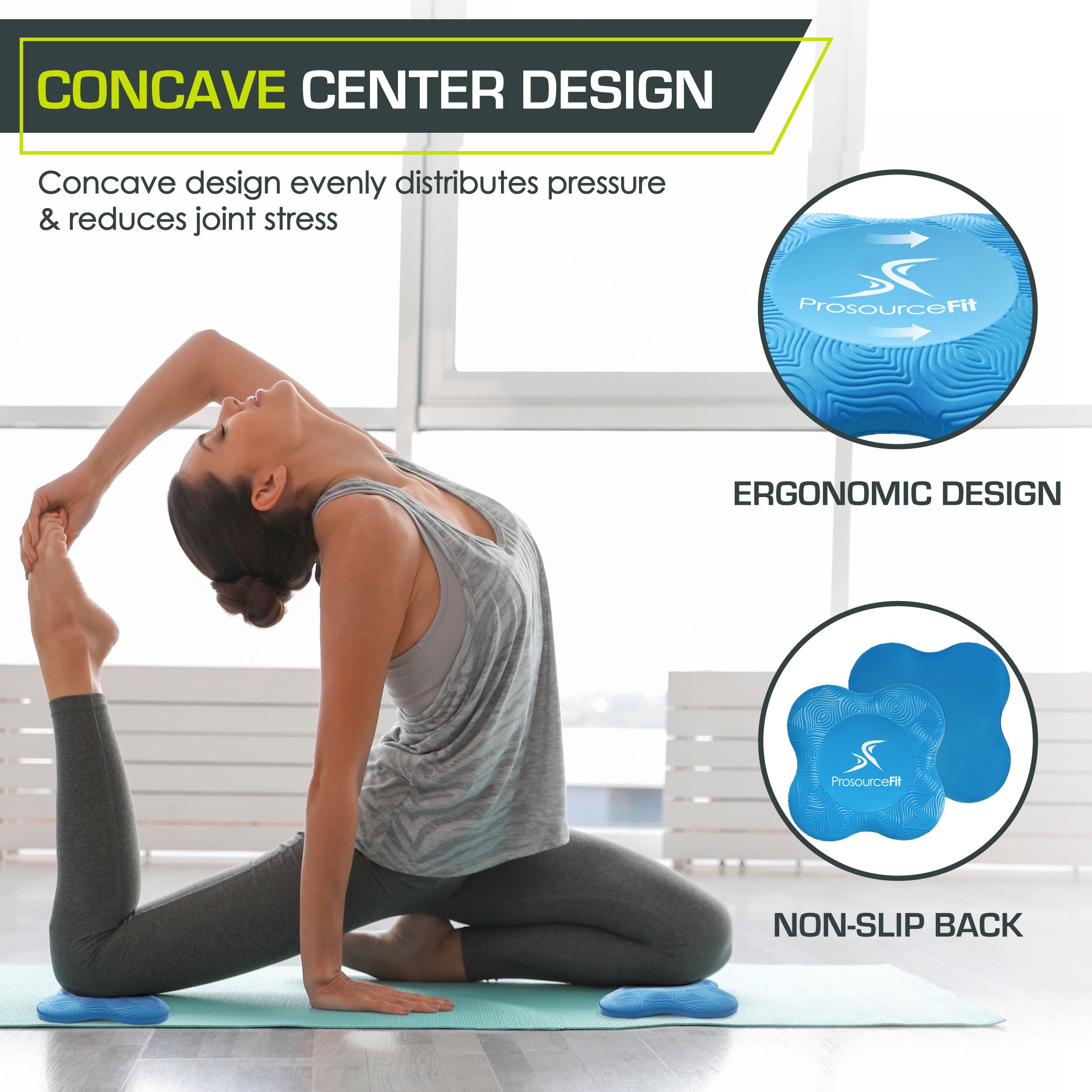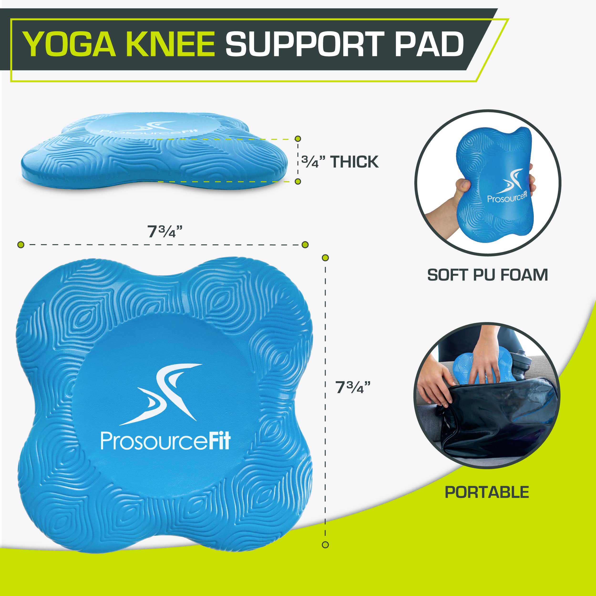 ProsourceFit Yoga Knee Support Pads (Set of 2) reduce friction, strain and discomfort to joints exposed to hard surfaces. Yoga knee pads are versatile as they can support knees, hands, wrists, foreheads and other body parts that may be exposed during exercise. Take the knee pad for yoga, pilates, cleaning, or numerous other applications as you may never know when you’ll need them. The knee mat measures 8 inches in diameter and is less than 1 inch thick. Offered in 5 colors, you will have a stylish, yet portable tool to carry with you for exercise. Made from lightweight PU Foam shaped in an ergonomic design, the yoga knee support pads are durable, eco-friendly and made to help you perform at your very best.