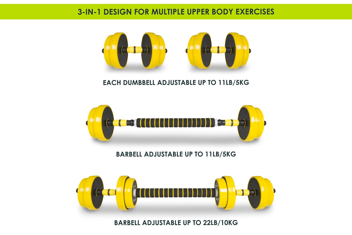 The ProsourceFit 2-in-1 Dumbbell and Barbell set provides the versatility for those who are looking for a convenient and efficient workout. The weights feature 2 variations with one up to 22lbs using 8 plates with 4x1kg plates and 4x1.25kg plates and the second variation up to 33lbs with 4x1.5kg and 4x2kg. There are also 2 heavier variations you can choose from using 12 plates with one up to 44lbs with 4x1.25kg, 4x1.5kg and 4x2kg and the second variation includes up to 55lbs with 4x1.5kg, 4x2kg and 4x2.5kg. Get in a full-body workout by using both dumbbells and the barbell up to 55lbs to perform bicep curls, shoulder presses, squats, deadlifts and lunges. Perform your best during your workouts and with the proper form with comfortable features. The free-weight set is also secured by spin-lock collars and is comfortable with the non-slip grip and cushioned features of the connecting rod. There is no need to worry about your garage or home gym floors either because of the rubber-coated plates. Not only do you save money by buying one piece of equipment but you also save space in your home gym. Everyone is looking for the next best addition to their home gym when they can get the most with one.