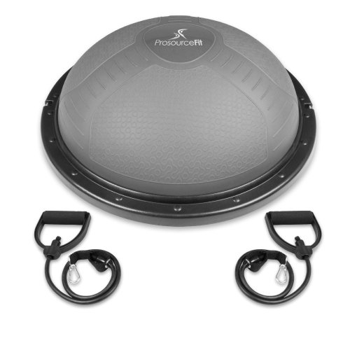 Looking to add more challenge to your workouts or just starting out in exercise? The ProsourceFit Balance Trainer is the perfect tool to enhance exercises and engage more muscles. Take squats, lunges, planks and so much more to the next level with this half-balance ball. Feel your core and leg muscles engage in every exercise and workout. Add resistance training into your workout with the detachable resistance bands included through lateral raises, shoulder presses and more. Each band has a resistance level of 15 to 20 pounds. The textured surface of the dome is designed to provide a slip-resistant grip to keep your footing during exercises. The burst-resistant PVC and rubber holds up to 330poundsandallows you to stand, sit and step up on the dome with safety. After workouts, deflate and conveniently store away your balance trainer under the bed, in the closet, garage or gym. With the included air pump, quickly inflate balance trainer back to recommended size before using again.