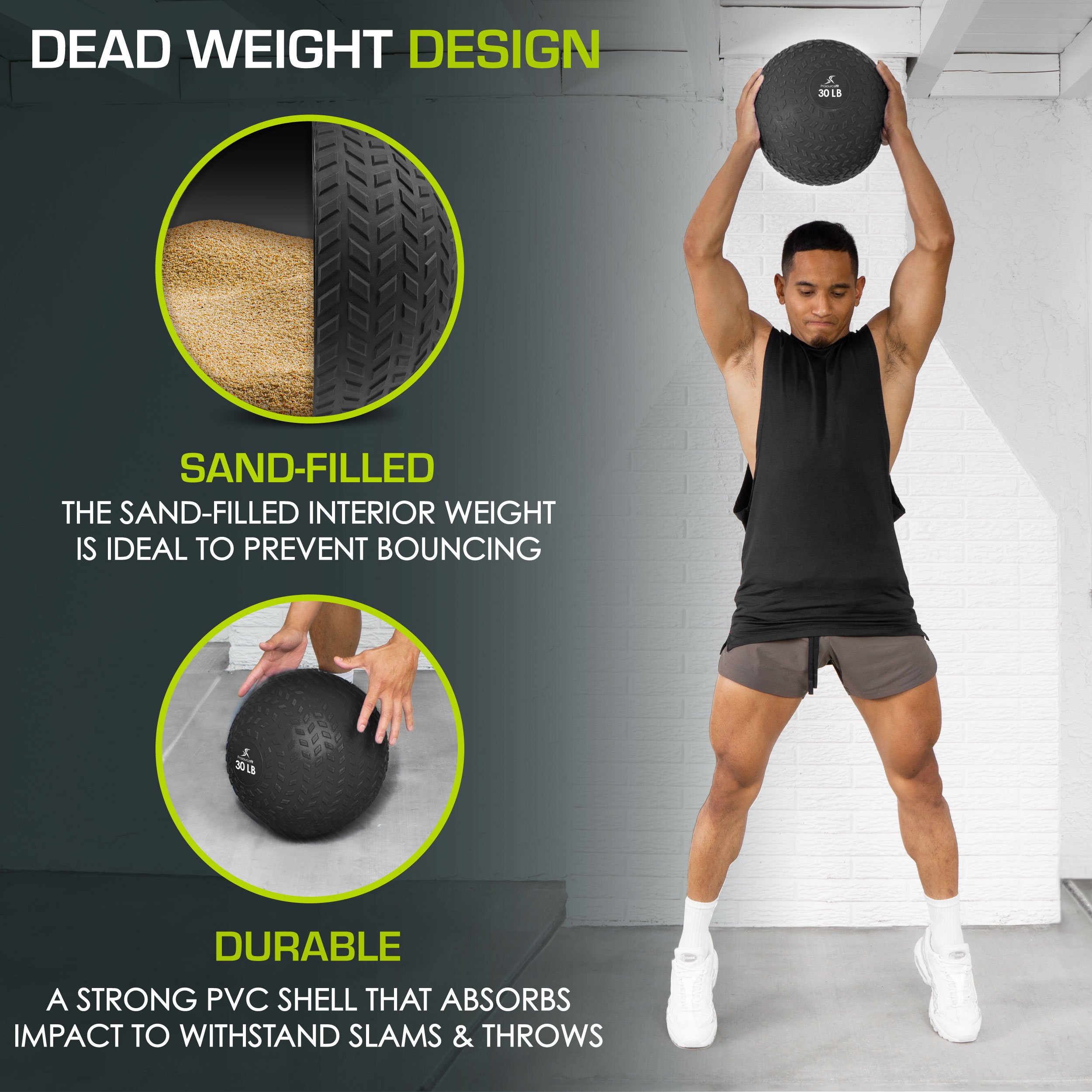 The ProsourceFit Tread Slam Medicine Balls are a fun way to boost your heart rate, get a full body workout and beat stress! A thick, durable rubber shell is built to take a beating from ball slams, wall throws, tossing with a partner and more. These explosive exercises are a great way to strengthen the core, arms, back and legs, as well as improve overall coordination. The tire tread-like surface on the Tread Slam Ball is ideal for intense, sweaty workouts and even more traction for throwing. The sand-filled dead weight ball means there is no bounce when you throw, so you can slam as hard as you can without it flying back or rolling away. Perfect for a heart-pumping workout and stress reliever. Use for powerful, dynamic exercises like overhead slams, rotational wall throws and wall balls. Or use in place of weights for muscle-building exercises like Russian twists, squats, lunges, overhead presses and more. Fitness weight balls come in various weights, making them perfect for beginners and advanced athletes alike. Use weighted fitness balls in your home gym, athletic training facilities, or outdoors for a slammin’ workout!