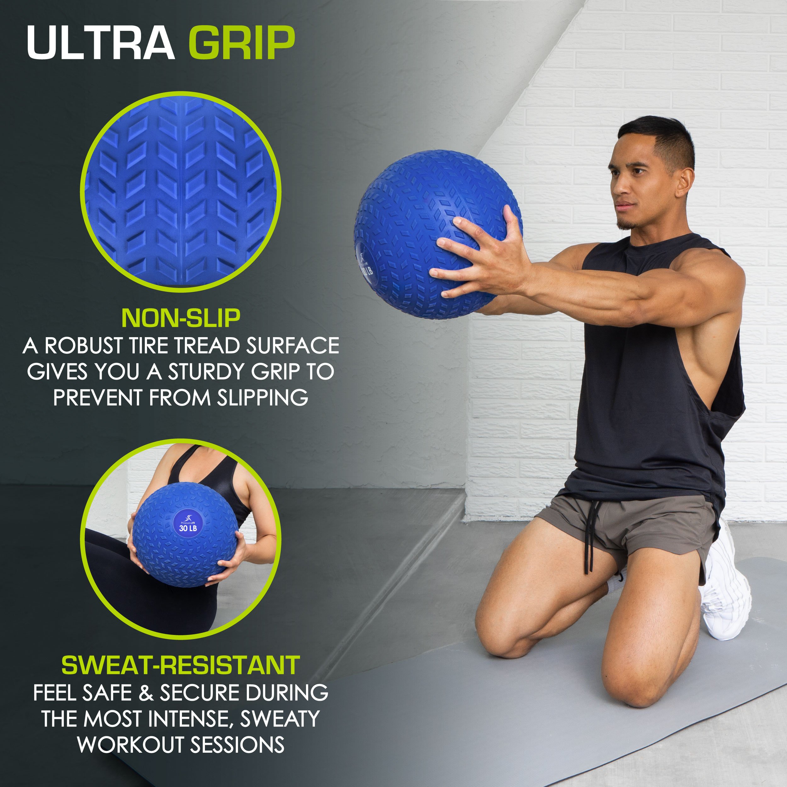 The ProsourceFit Tread Slam Medicine Balls are a fun way to boost your heart rate, get a full body workout and beat stress! A thick, durable rubber shell is built to take a beating from ball slams, wall throws, tossing with a partner and more. These explosive exercises are a great way to strengthen the core, arms, back and legs, as well as improve overall coordination. The tire tread-like surface on the Tread Slam Ball is ideal for intense, sweaty workouts and even more traction for throwing. The sand-filled dead weight ball means there is no bounce when you throw, so you can slam as hard as you can without it flying back or rolling away. Perfect for a heart-pumping workout and stress reliever. Use for powerful, dynamic exercises like overhead slams, rotational wall throws and wall balls. Or use in place of weights for muscle-building exercises like Russian twists, squats, lunges, overhead presses and more. Fitness weight balls come in various weights, making them perfect for beginners and advanced athletes alike. Use weighted fitness balls in your home gym, athletic training facilities, or outdoors for a slammin’ workout!