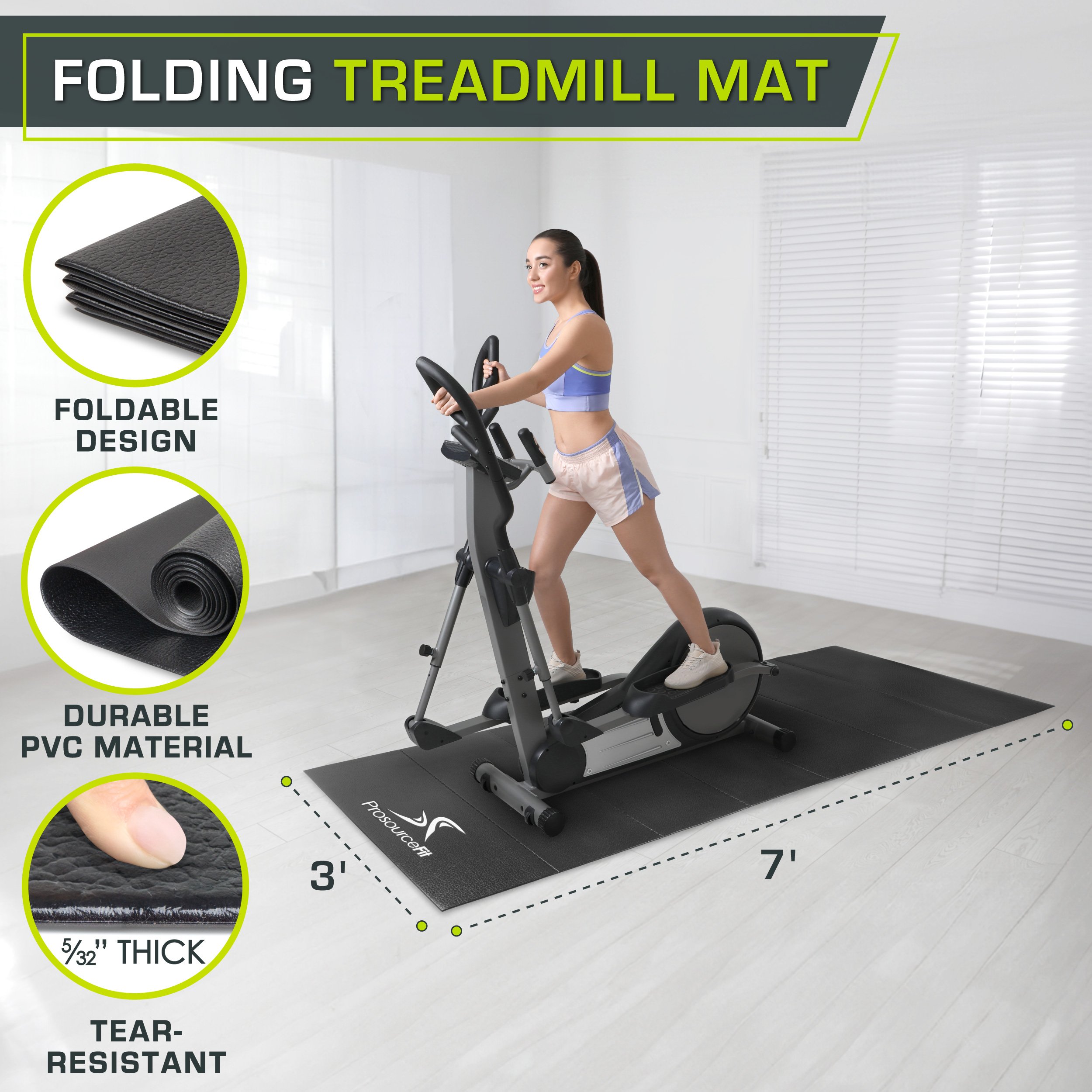 Whether you’re setting up a workout space at home, or need to protect the floor at your gym, the ProsourceFit Treadmill Mat is the perfect solution to keep your equipment in place and pre-vent damage to wood floors, tile, or carpet. Constructed from high-density PVC, the 4mm thick mat provides ultimate protection from scratches and dents wherever you workout. The impact-absorbing surface also helps to reduce noise and vibrations from machines when you’re run-ning or getting in your aerobic exercise. The large 6.5’x3’ size fits comfortably under most treadmills, stationary bikes, rowers, elliptical trainers and more. You can also use it under-neath a weight bench, rack, or set of weights. Ideal for garages, basements and gyms. The gently textured surface prevents slipping and is easy to clean and wipe down after a sweaty workout. It is an essential accessory if you own or plan to purchase a treadmill, exercise bike, elliptical or any other type of fitness equipment. Plus, you can feel secure in your purchase with ProsourceFit’s limited lifetime warranty.