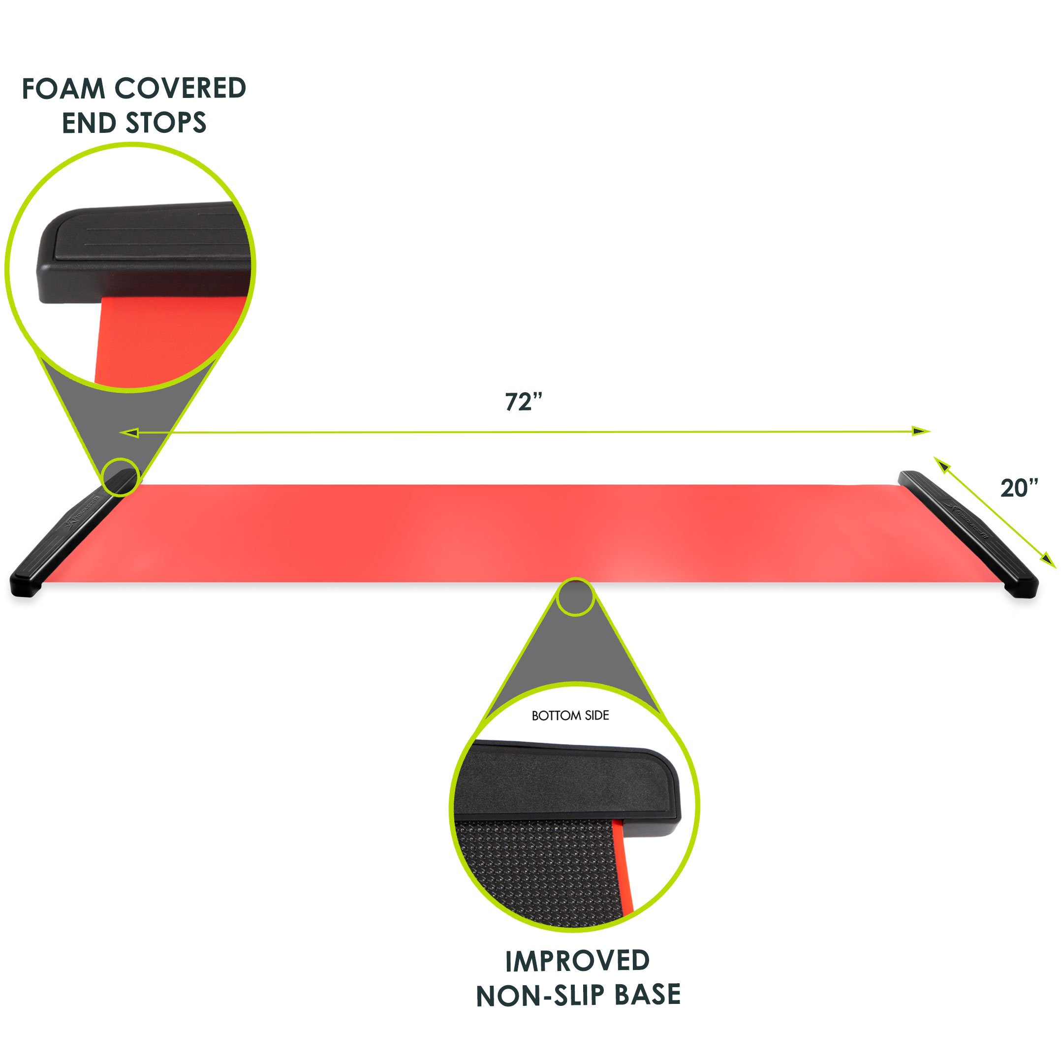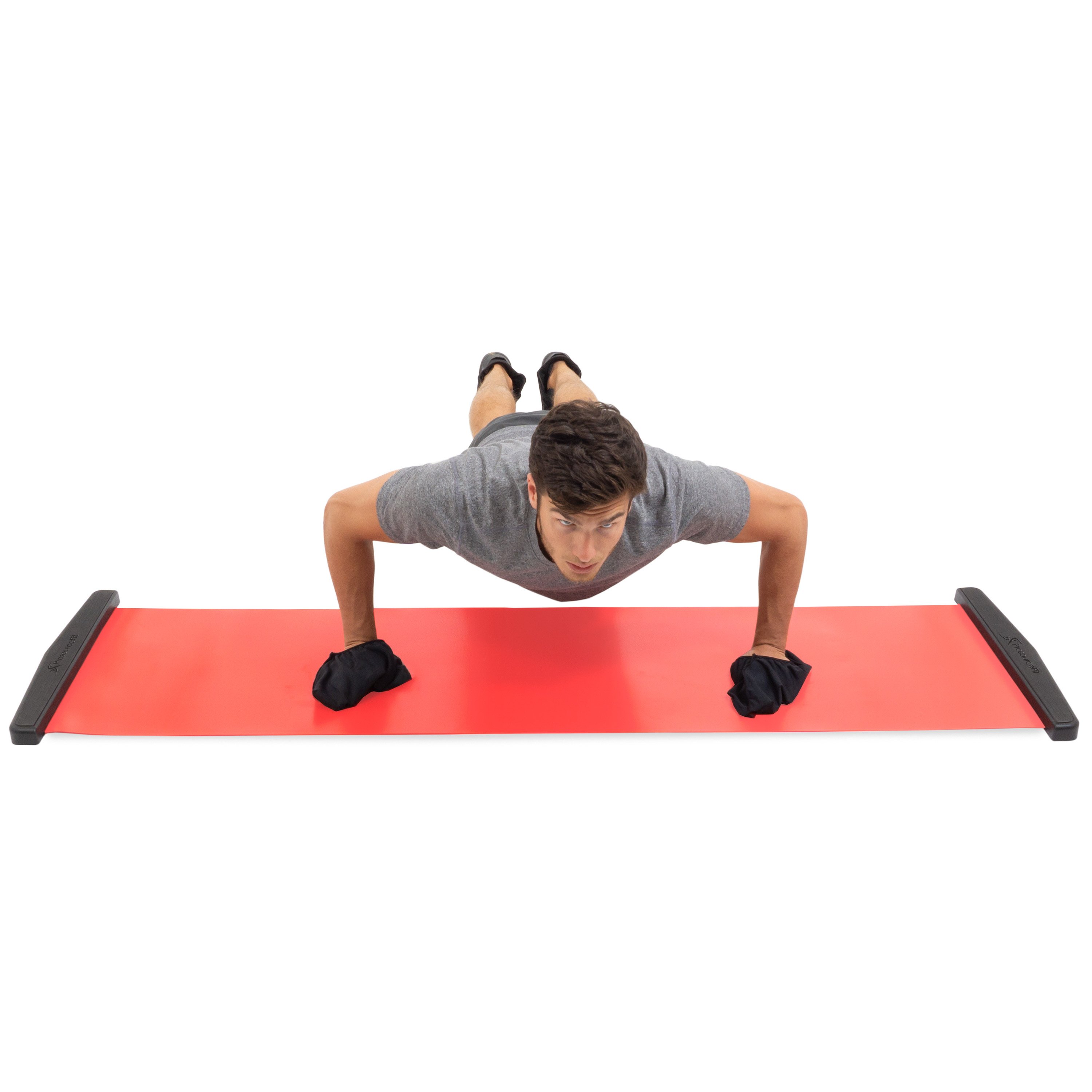 Slide into stellar shape with the ProsourceFit Slide Board for high intensity exercise! End stops help you to glide quickly and maintain momentum for a great cardio and lower body workout that’s also low impact! Whether you’re training for hockey, baseball, recovering after an injury, or just want a good cardio slide board workout you can do at home, this fitness mat can help you reach your goals. At 6-feet long, it’s great for a variety of users, ages and athletic purposes. This lightweight gliding mat comes with free booties and a mesh carrying bag for easy storage and portability. You can move both laterally as well as forward and backward to train your muscles in multiple planes of motion. But don’t stop at just sliding! The Lycra booties and slick surface are an excellent way to perform lunges, mountain climbers, sliding push-ups and more. Put the booties on your hands or feet to enhance your stability and strength as you glide through your usual exercises. By keeping your feet connected to the floor, rather than stepping or jumping between movements, you’ll challenge your muscles in new ways so you keep seeing results. The closed-chain exercises are great for physical therapy, opening up tight hips and reducing knee pain. Strengthens hip stabilizers, which can help reduce common overuse injuries like knee pain and prevent future injuries due to weak hips. The textured non-slip PVC bottom prevents sliding when the mat is on hard floors and can also be used on carpet. It’s perfect for homes, gyms, training studios and rehab facilities. It can be easily rolled up and stored in the carry bag so you can take your slide board training on the road, or just keep your space clean when it’s not in use. If you need to increase the slickness of the sliding surface, simply spray with silicon spray to keep it in top condition.