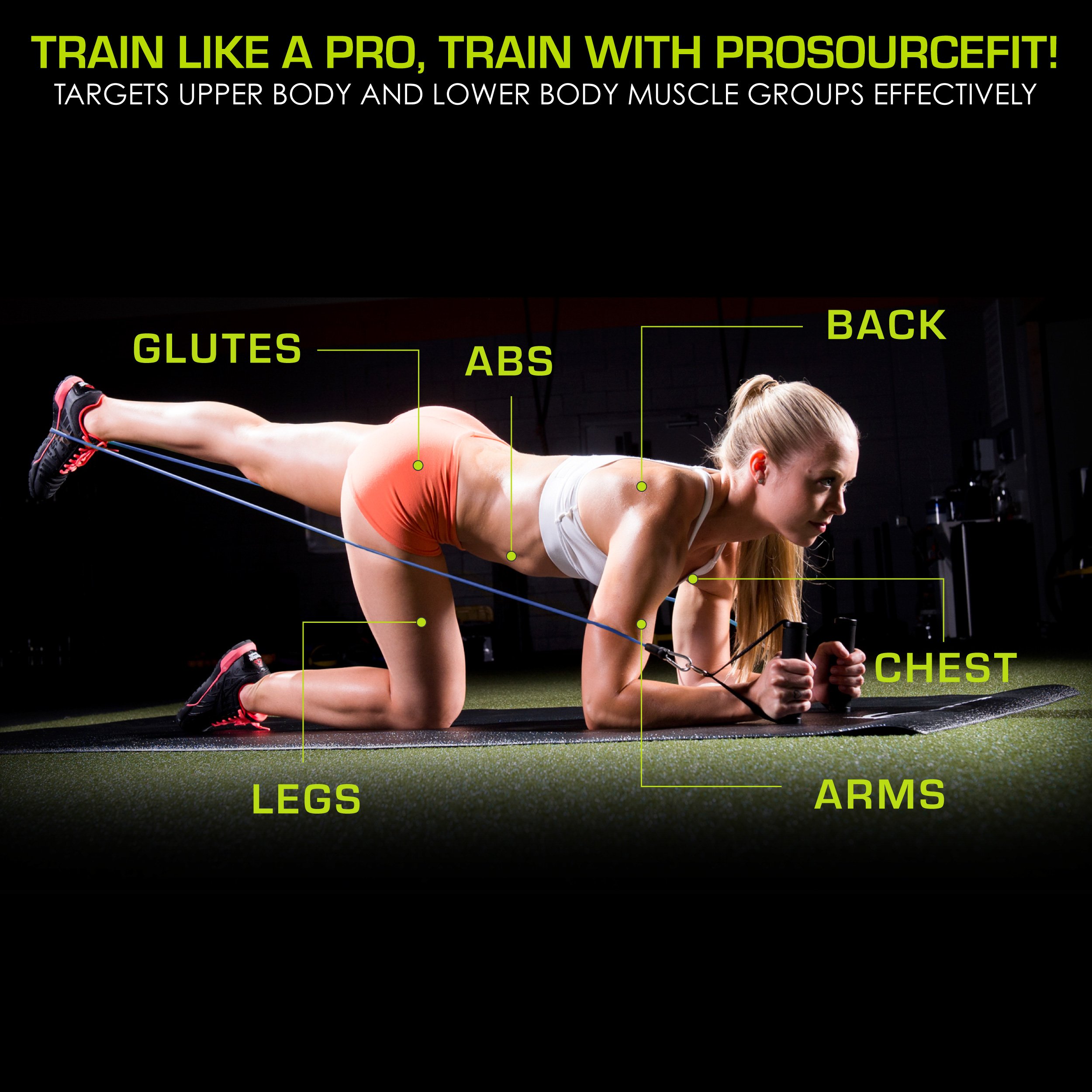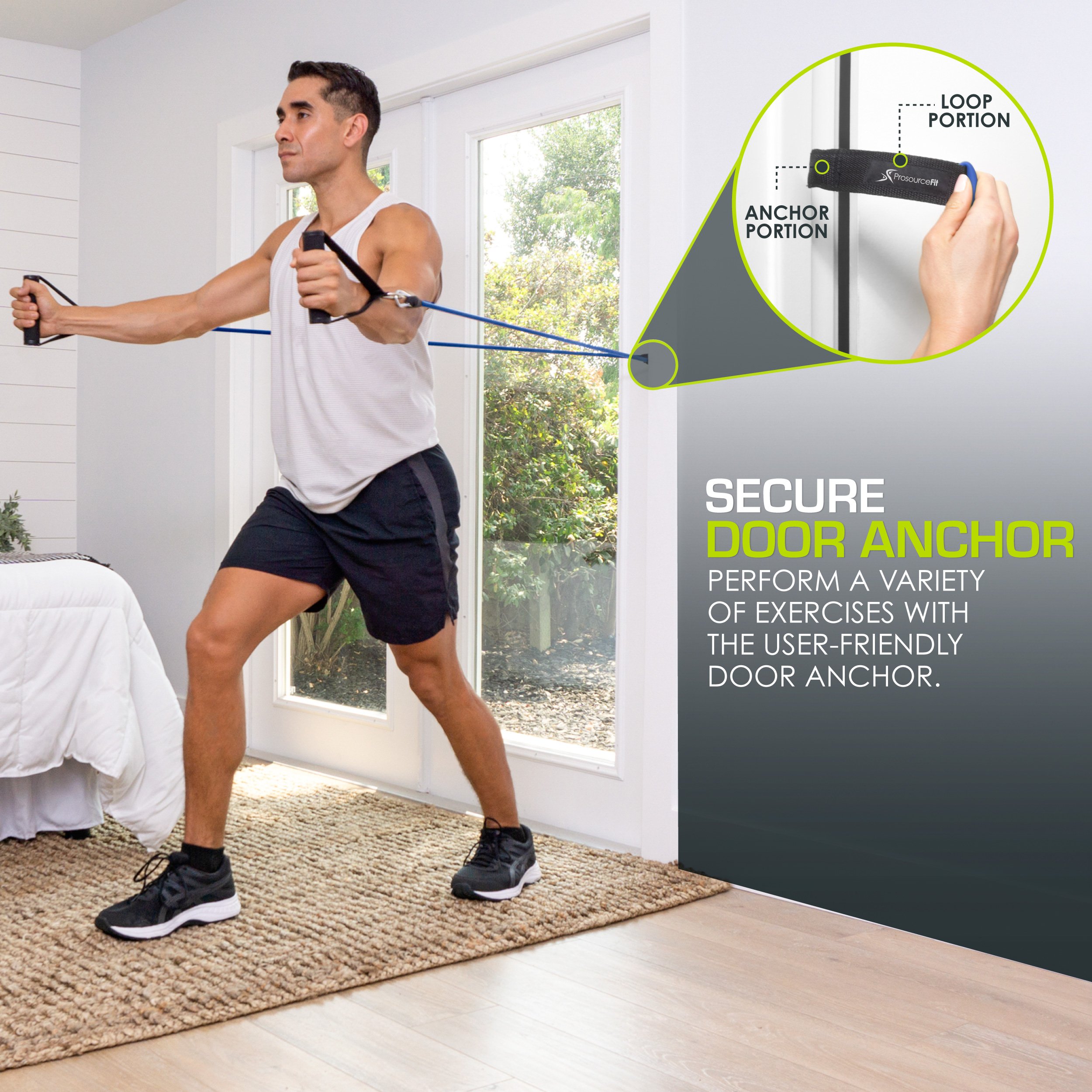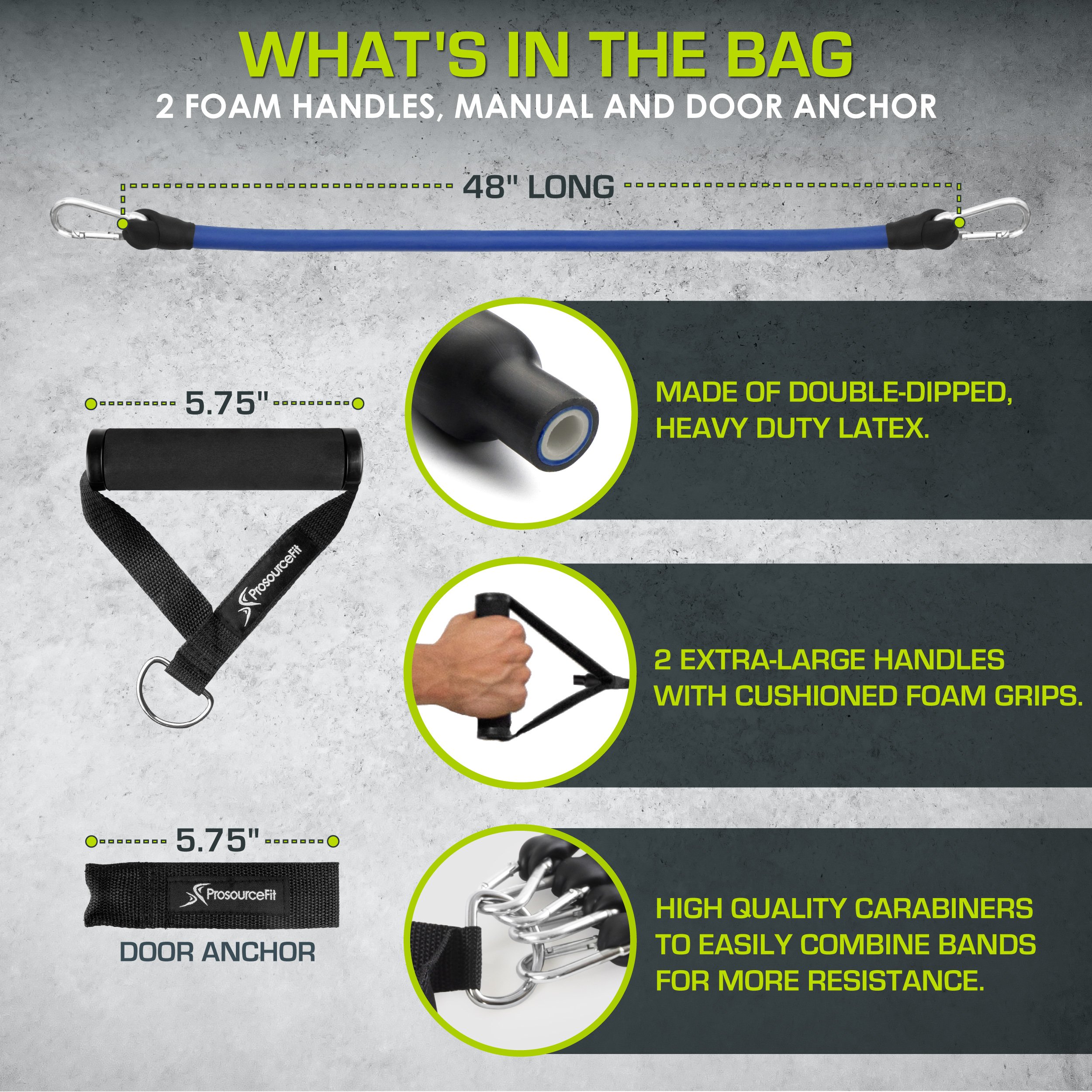 ProsourceFit Resistance Bands are perfect for anyone who wants to stay fit but can’t make it to the gym. One simple band with detachable handles can be used for a variety of toning exercises and stretches. Depending on where you place it, stand on it, or an-chor it in a doorway, you can perform a full body workout with exercises like back rows, chest presses, shoulder raises, bicep curls and leg extensions. Elastic bands allow you to work muscles from different angles with a greater range of motion than with tradition-al weight training machines for improved strength, balance and coordination. Available in 7 color-coded resistance levels from 5 to 50 pounds, they are an excellent tool for any level of fitness. Easy-to-use metal carabiners allow you to clip bands together for heavier resistance as needed. Each resistance tube is 48-inches long with cushioned foam handles for a comfortable grip. A door anchor is included so you can take your workout anywhere! Perfect for use with P90X, Pilates Slimin6, Insanity, Yoga and other training programs. The heavy duty, double-dipped latex material is durable yet light-weight. Compact and hassle-free, it’s the perfect solution for anyone trying to stay fit and healthy while on the run. Resistance Levels Green- 5 to 8 pounds Red- 8 to 12 pounds Blue- 12 to 16 pounds Black- 16 to 20 pounds Purple- 20 to 30 pounds Blue- 30 to 40 pounds Brown- 40 to 50 pounds