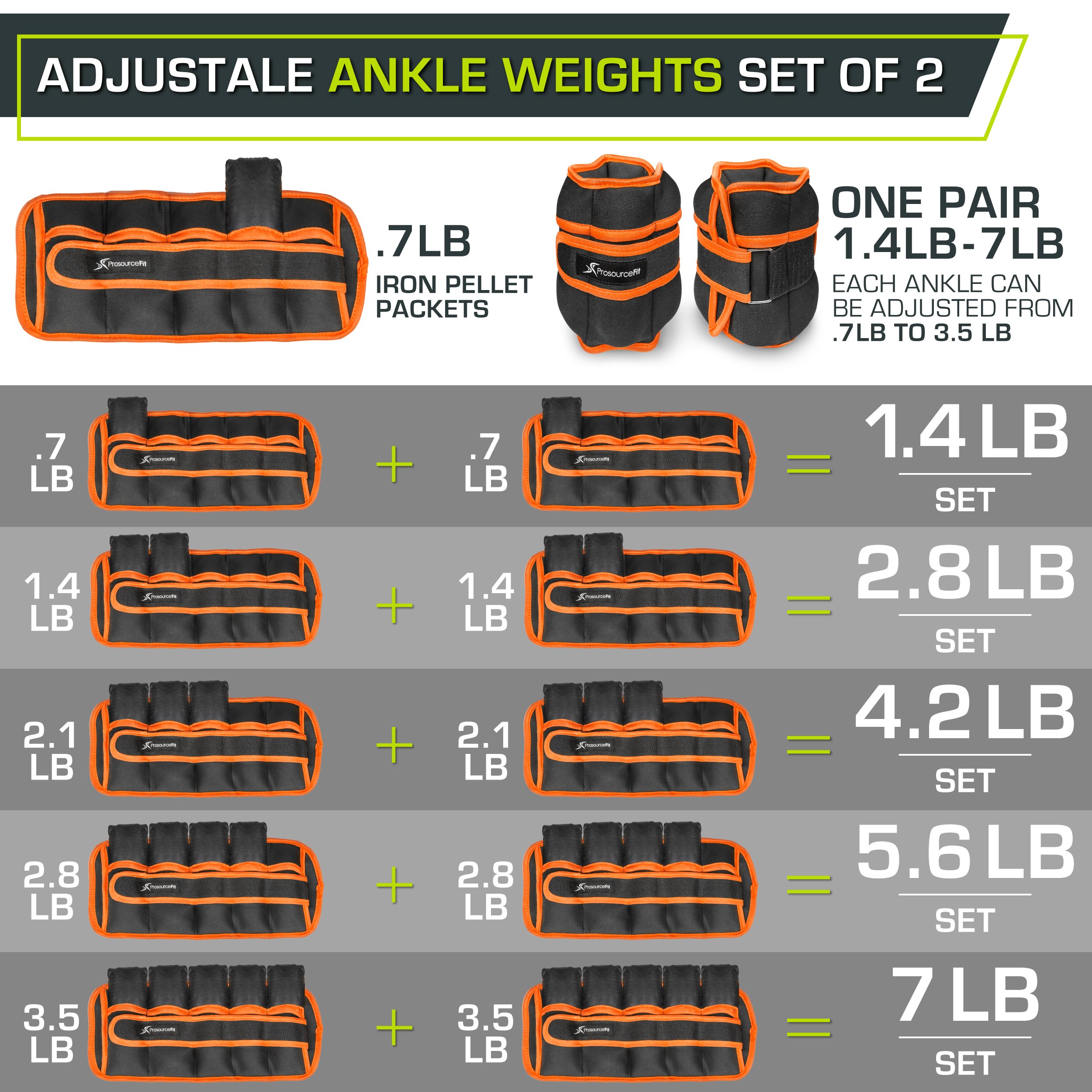 Increase the intensity of your workouts and see faster results by adding ProsourceFit Ankle Weights to your cardio, plyometric, walking, dance, or weightlifting routine. Ranging from one to five pounds, these comfort-fit weights wrap gently around your ankles to safely add more resistance to tone and sculpt your lower body. Turn basic exercises like walking, jumping, lunging, aerobics, or leg lifts into muscle-building and calorie-burning movements. Whether trying to lose weight, tone up or rehabilitate after injuries, ankle weights provide an additional challenge and allow you to slowly and safely increase the weight as you progress. Six different weight options are color-coded so you can have a few on hand to change depending on the intensity level you need. Adjustable Velcro straps make it easy to take them on and off and a metal hook and loop closure allow you to tighten them securely to prevent slipping while you work out. Neoprene material on the 1 to 3-pound weights is soft on your skin for comfortable workouts. Please note that our 5 pounds weights are designed slightly differently with durable Oxford nylon to withstand the extra weight of the filling and prevent breakage. The filling cannot be added or removed the weight is exactly as listed. ProsourceFit Ankle Weights come with a limited lifetime warranty for manufacturer defects so you can feel confident about your purchase.