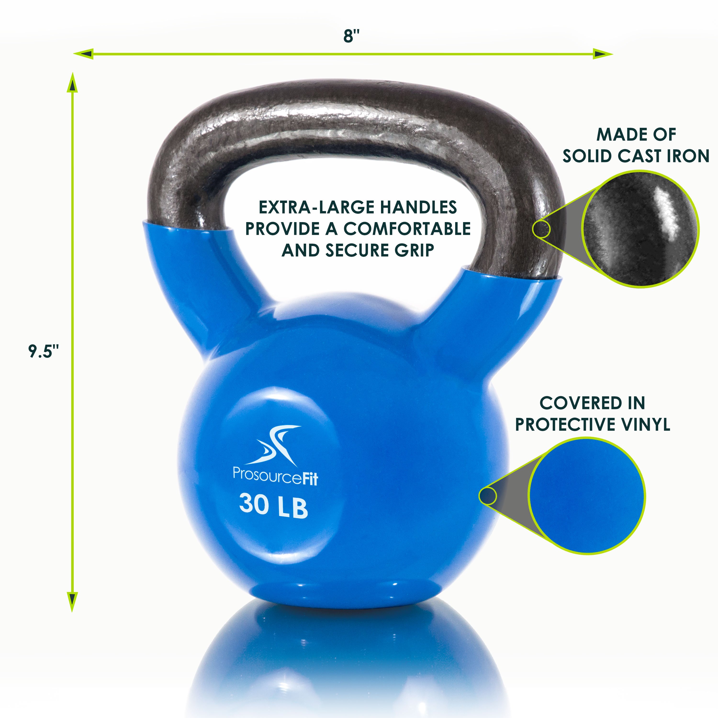 The ProsourceFit Vinyl Kettlebells provide an excellent full body workout and can be done anywhere. A more economical choice than cast iron, these concrete kettlebells are vinyl-coated to reduce floor damage and noise. The heavy, uneven distribution of weight forces your body to build core strength and balance when in use. Great for squats, swings, cleans, presses and a variety of other exercises that are proven to build muscle size and strength. The extra-large handle makes it easy to grip with one or both hands for a safer, more comfortable workout and the durable material is built to last without wear and tear. Available in a variety of weights, so they can be used by both beginners and advanced athletes.