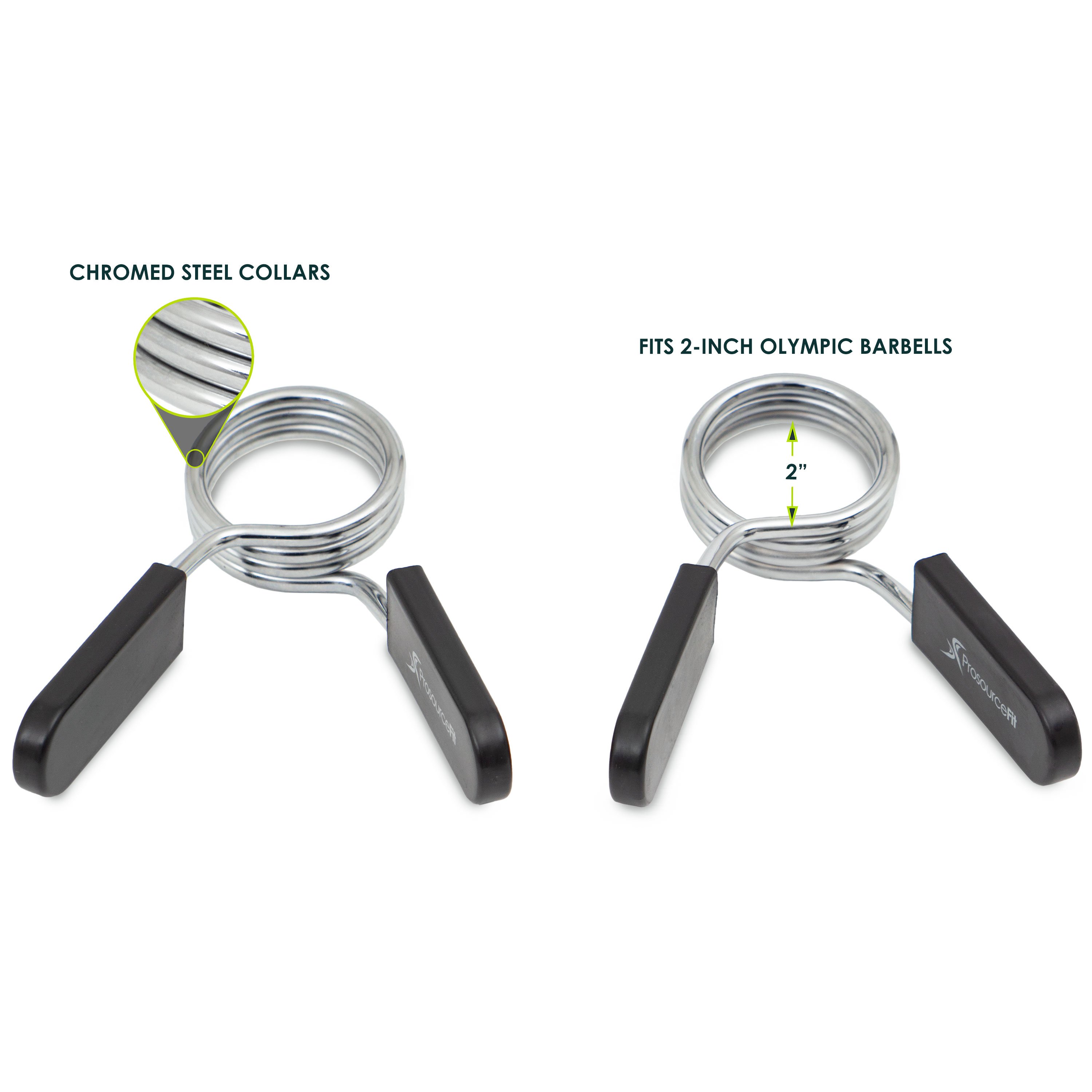 Ensure your safety when you’re lifting weights, whether it’s explosive workouts, heavy powerlifting, or general strength training. A sliding weight or bumper plate can not only cause you to lose balance, but can be a serious safety hazard. Prevent injuries and stay focused on your perfect form by using ProsourceFit Olympic Spring Clip Collars. The sturdy chromed steel collars provide ample tension to secure plates on any standard 2-inch barbell. Smooth plastic handles make them easy to grip and slip on and off as you increase weight, ideal when your hands are sweaty from an intense training session! The simple design is easy to use and provides a secure fit every time. At only 7.8 oz per clip, you’ll only add a miniscule amount to your bar, and they’re compact enough you can keep a pair in your gym bag for those times when all of the other clips at the gym are being used. They’re also ideal for home gyms. Get a few pairs so you don’t have to switch them around as often – one set for the bench, and one for the squat rack. These are a necessary piece of equipment for serious athletes, ideal for squats, deadlifts, cleans, bench presses, snatches, and more. You can also feel secure in your purchase with a limited lifetime warranty on these clips and all ProsourceFit fitness products.